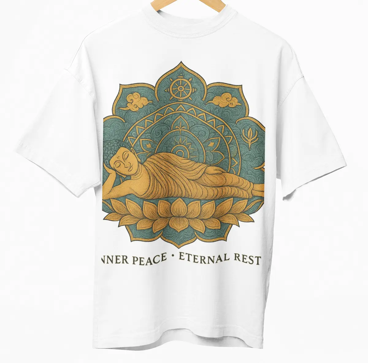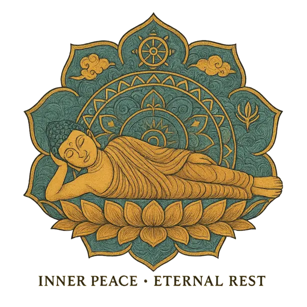 The artwork is framed within a detailed mandala flower and enhanced with spiritual icons like the Dharma Wheel, lotus petals, Bodhi symbols, and swirling clouds—all rendered in calming teal, gold, and sandstone tones. At the base, the words “INNER PEACE · ETERNAL REST” are softly embedded to reinforce the meditative theme.