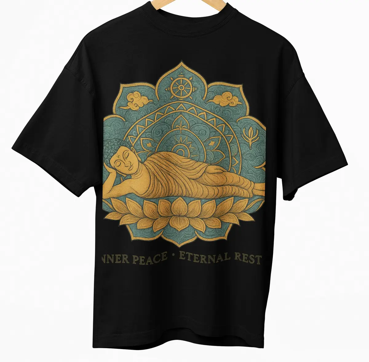 Radiating serenity and spiritual symbolism, this Sleeping Buddha mandala design captures Lord Buddha in his final Parinirvana pose, enveloped by intricate sacred motifs and lotus petals. Perfect for conscious fashion, yoga wear, and spiritual merchandise, the artwork includes the peaceful affirmation:
