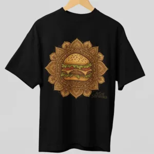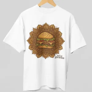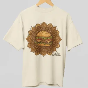 “Where tradition meets taste! This fun and unique burger mandala art design from Art of Shravika combines the mouth-watering appeal of a juicy burger with the elegance of traditional Indian mandala artwork. Designed for foodies, creatives, and streetwear lovers